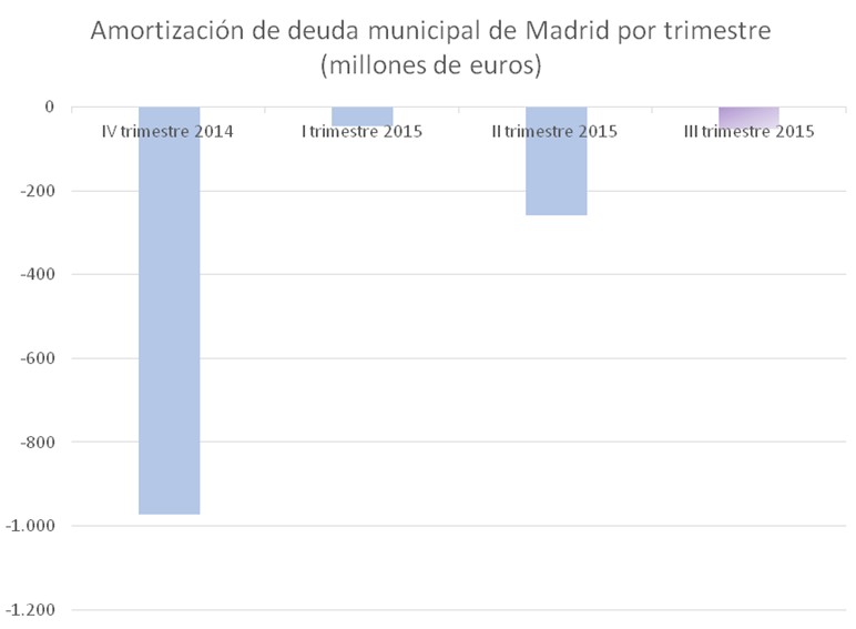 En concreto, de los 1.324 millones de reducción de deuda municipal entre septiembre de 2014 y septiembre de 2015, sólo 53 millones se amortizan en el tercer trimestre de 2015: es decir, Ahora Madrid sólo es responsable del 4% de toda la amortización de deuda del último año. De hecho, fijémonos en que prácticamente toda la amortización de deuda se concentra en el cuarto trimestre de 2014.