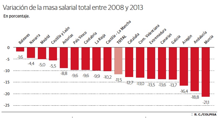 Entre 2008 y 2013, la profunda crisis económica que ha sufrido España ha tenido un efecto depresivo en los sueldos de los trabajadores. No obstante, el reparto de esta caída ha sido muy desigual si analizamos los datos región por región.
