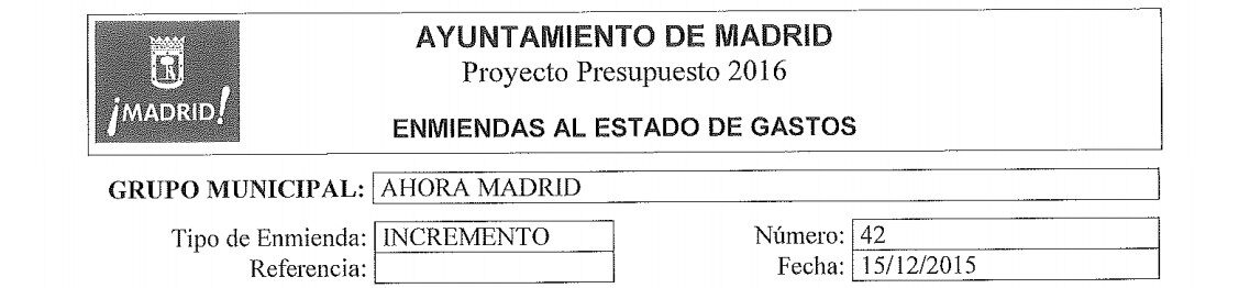 - Más gasto en informes. Solamente en el área de Economía y Hacienda, el gobierno de Ahora Madrid tenía previsto un presupuesto para encargar informes por valor de 3,3 millones de euros. Una de las enmiendas registrada por la formación comunista aspira a reforzar estos gastos a base de "incrementar en 100.000 euros la dotación presupuestaria para gastos de estudios y proyectos técnicos en materias relacionadas con la gestión de fondos europeos". Pero hay más: también se plantea un gasto de 55.000 euros para "adaptar el Paseo de la Castellana a un modelo de movilidad más sostenible".