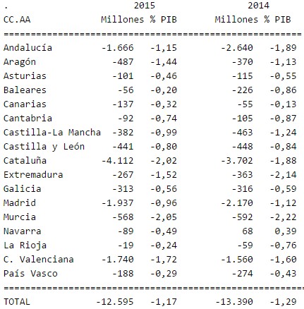 El siguiente cuadro recoge, por comunidades autónomas, la capacidad (+) o necesidad (-) de financiación hasta octubre y la comparación con 2014: