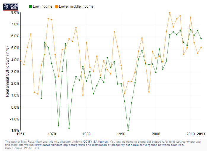 Otra noticia positiva es la del afianzamiento del crecimiento económico en los países menos desarrollados. En las últimas décadas, las economías de ingresos bajos (línea roja) y los países de renta media-baja (línea naranja) han experimentado un aumento casi ininterrumpido del PIB que, además, ha evolucionado al alza, con niveles medios del 6-8% durante los últimos años.