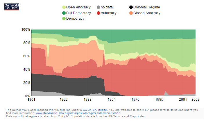 Pero estos avances también han ayudado a liberalizar el marco político en el que conviven las personas. Así, aunque a principios del siglo XX solamente el 10% de la población mundial vivía en países democráticos, hoy vemos que más de un 50% entra en esta categoría.