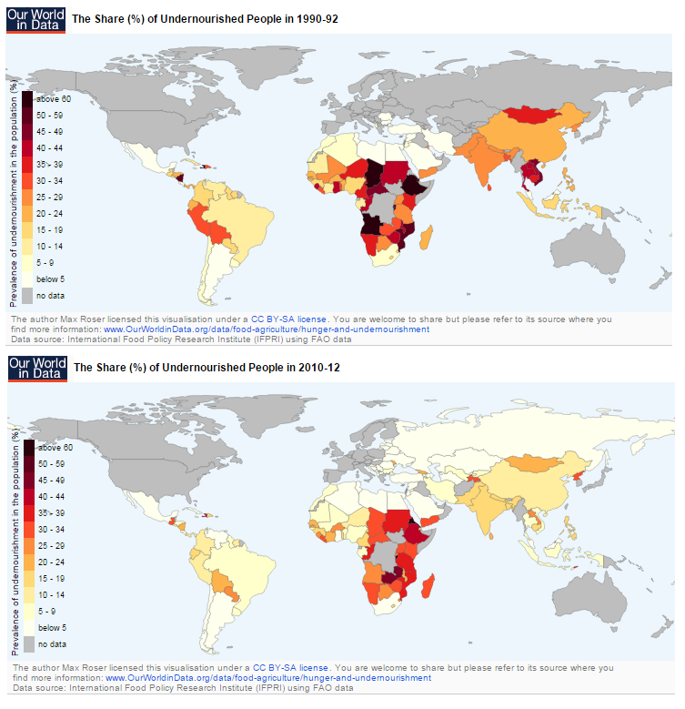 Algo parecido ocurre si hablamos del problema del hambre. Aunque sigue habiendo millones de personas que lo padecen, la desnutrición ha caído un 40% entre 1990 y 2012, como reflejan los dos siguientes mapas, elaborados con datos de la FAO.