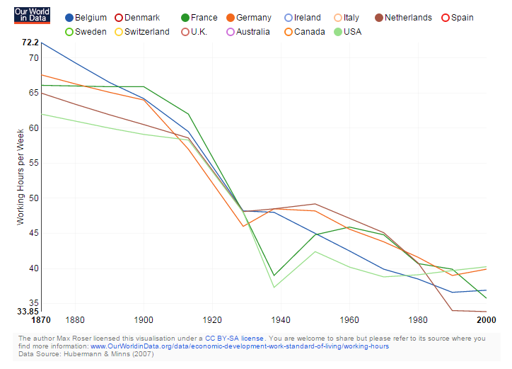 También se observa una bajada en el número de horas trabajadas, explicada por las mejoras tecnológicas así como por la mayor productividad de los trabajadores. En las economías desarrolladas, este indicador ascendía a 60-70 horas por semana hace ahora un siglo, mientras que en las décadas de 1940 a 1970 se movió en el entorno de las 50 horas semanales y hoy se empieza a aproximar a la barrera de las 35.