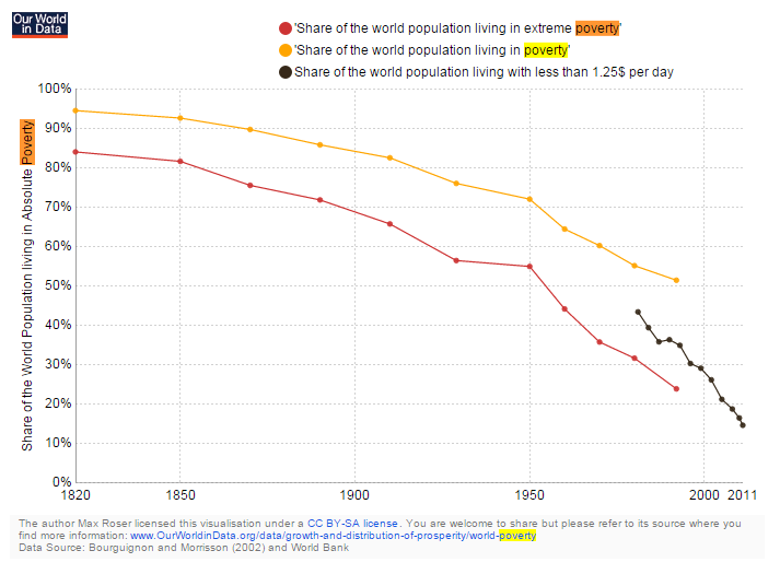 Pensemos, por ejemplo, en la incidencia de la pobreza. Hace dos siglos, entre el 80% y el 90% de la población sufría esta lacra. Más recientemente, en 1950, la miseria seguía afectando al 60-70% de la humanidad. Sin embargo, los últimos datos del Banco Mundial apuntan que, a pesar del importante aumento de la población a nivel internacional, la tasa de pobreza ya se encuentra en el entorno del 10%.