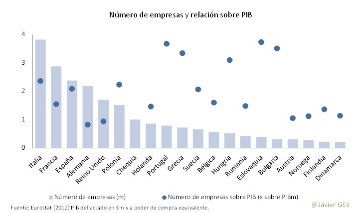 Según datos de Eurostat referidos a 2012, la "demografía" empresarial en España superaba los dos millones de sociedades (se excluye el sector público), solo por detrás de Italia y Francia en la Unión Europea, pero por encima de Alemania o Reino Unido. En valores relativos (número de empresas sobre el PIB), nos situamos en la parte alta del ranking, precedida por países como Italia, Grecia y Portugal.