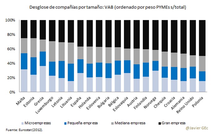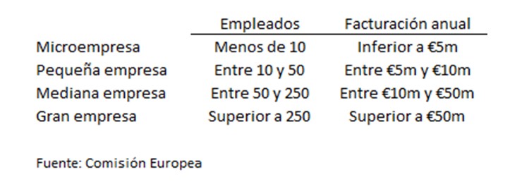 Una de las principales características de la economía española, en la comparación internacional, es el elevado peso de las pequeñas y medianas empresas (pymes), tanto respecto al conjunto corporativo como con relación al empleo y al Valor Añadido Bruto (VAB o diferencia entre ventas y aprovisionamientos). Para considerar a una empresa micro, pequeña, mediana o grande utilizaré el criterio de empleo de la Comisión Europea.