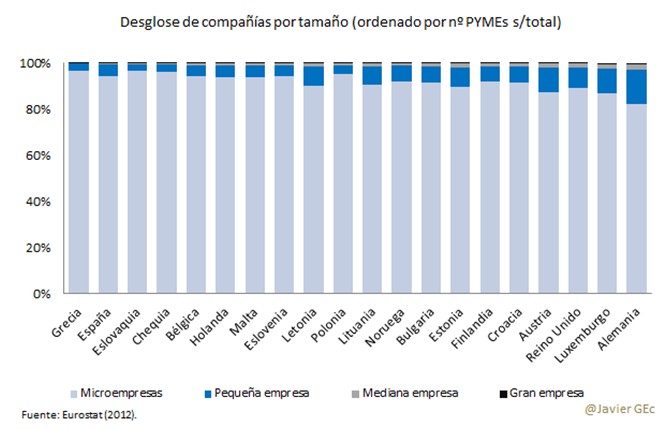 Si nos centramos en las pymes, el peso de las microempresas es comparativamente superior al del resto de países y el de las medianas comparativamente inferior (solo Eslovaquia y Grecia tienen un menor porcentaje de la mediana empresa sobre el subtotal pyme).