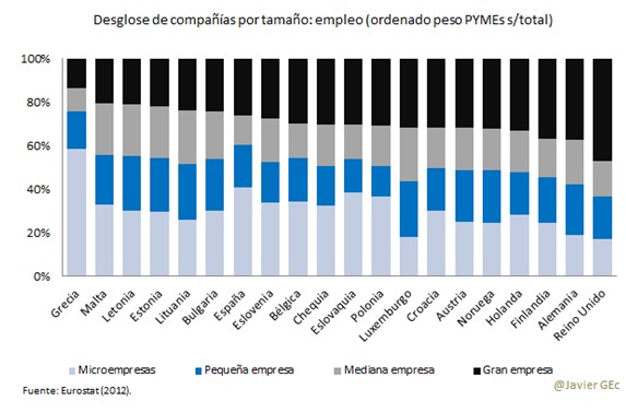 En términos de empleo, y si se compara con el gráfico anterior, España pierde posiciones. El peso de las pymes es relativamente menor si lo medimos en ocupación. Ello se debe a que las sociedades de tamaño mediano tienen menos relevancia que las de pequeña dimensión.