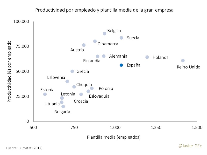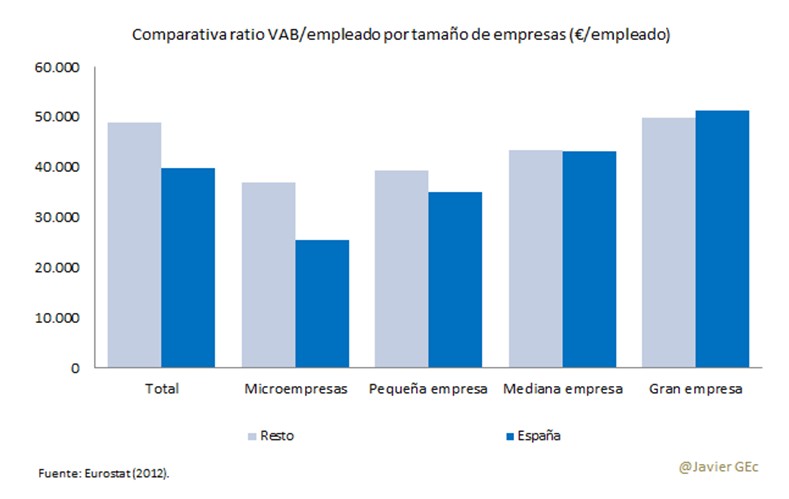 Este hecho determina una menor productividad de la economía española. Existe, por un lado, un efecto composición, al ser las pymes menos productivas que las grandes empresas. Entre otros factores, las grandes corporaciones tienen más capacidad para ajustar costes, su mayor tamaño les permite utilizar economías de escala, así como capacidad de diversificación y mejor acceso a la financiación.