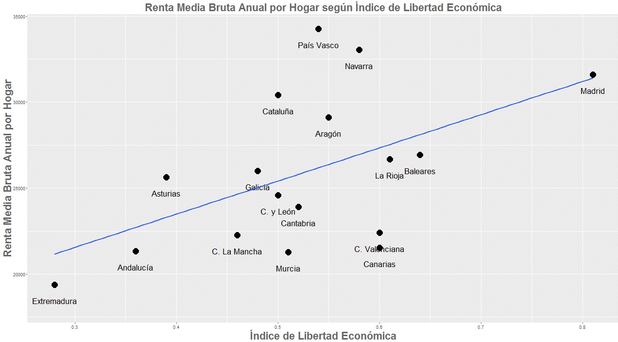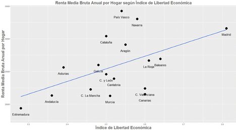 Si ponemos en contraste el índice acuñado por Civismo con la renta bruta media anual de los hogares obtenemos resultados que tampoco dejan demasiado espacio para la duda: Aquellas comunidades con menos intervención pública son también las más ricas.