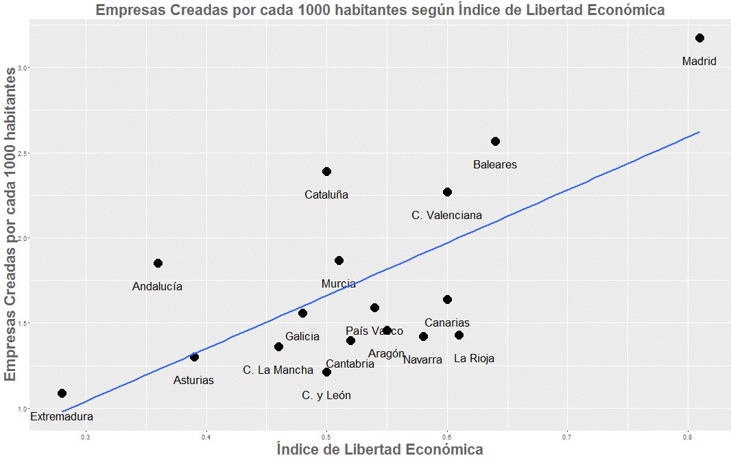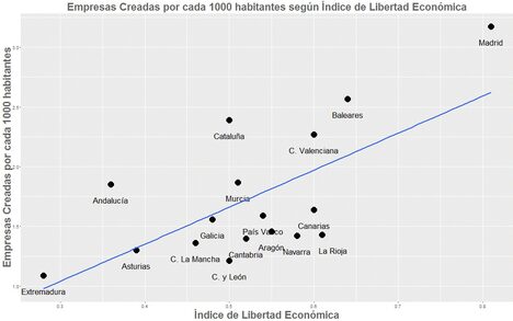 Los datos, de nuevo, se ponen del lado de las comunidades más liberales: Las cifras más altas de empresas creadas en 2014 por cada 1.000 habitantes se dan en las comunidades donde la presencia del Estado se deja notar menos.
