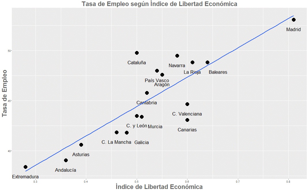 El análisis del Índice de Libertad Económica que se desprende de dicho informe nos lleva a conclusiones que parecen poco consistentes con el discurso liberticida de la izquierda patria. En primer lugar, aquellas CCAA donde se goza de mayor Libertad Económica (como Madrid, Baleares o Navarra) tienen también asociadas las tasas de empleo más elevadas. Tampoco parece casual, atendiendo a los datos, que las regiones con más regulaciones estatales e intervencionismo registren los niveles de empleo más deteriorados