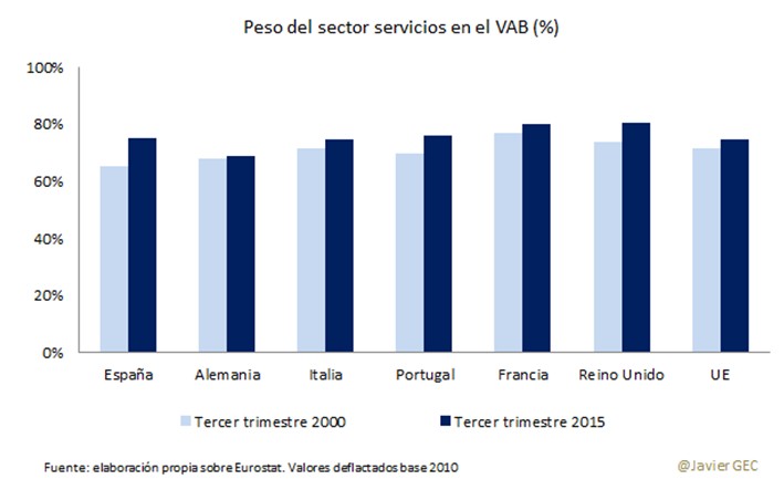Esta circunstancia es la tónica general en la evolución histórica y tiene que ver con el elevado peso de los servicios en el PIB español. Según datos de Eurostat, el sector servicios supone en España el 75% del PIB, nivel por otra parte similar al de economías de nuestro entorno (el promedio en la UE es el 74%).