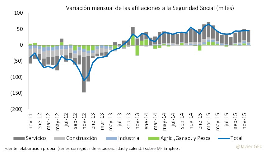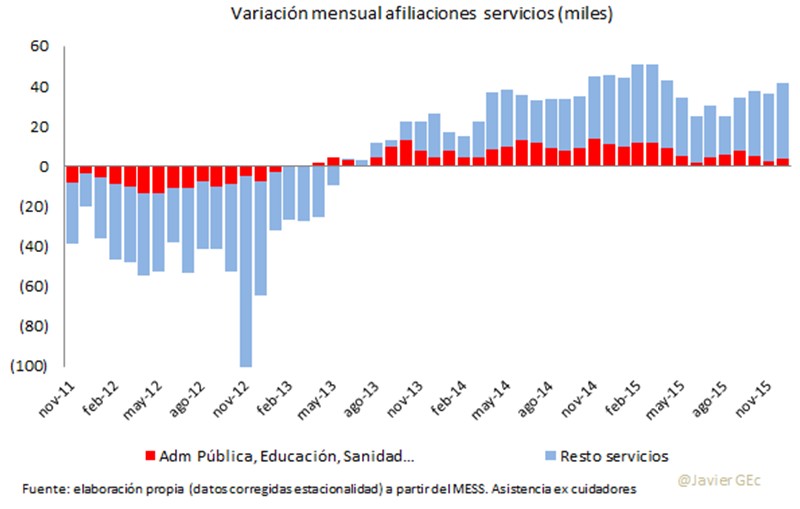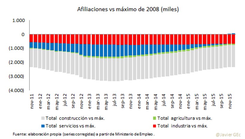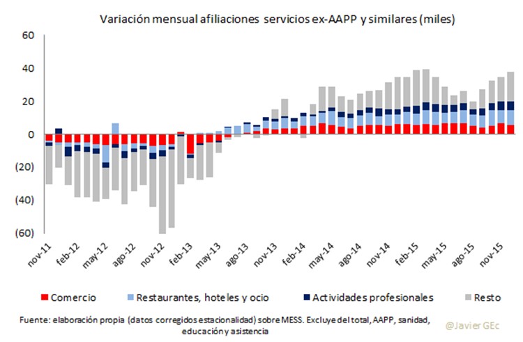 El crecimiento del empleo en los servicios permite cerrar la legislatura con un saldo neto positivo, compensando la destrucción en la industria y la construcción (probablemente los servicios hayan servido como vía de reciclaje para antiguos trabajadores en la construcción). En concreto, durante los últimos cuatro años se ha producido un incremento de 466.000 afiliaciones en servicios en comparación con una pérdida de 403.000 en el resto de sectores.
