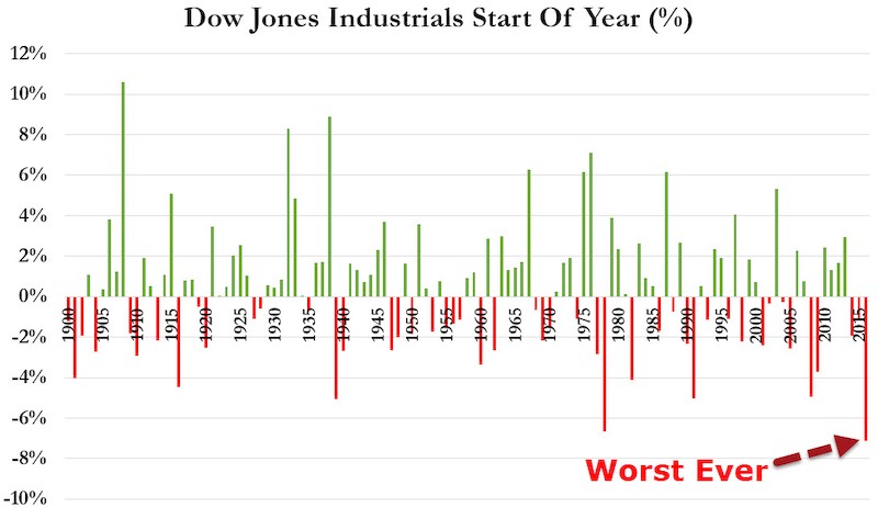 Wall Street cerró el miércoles con fuertes pérdidas y el Dow Jones de Industriales, su principal indicador, cayó un 2,21%, arrastrado por el petróleo y el mal desempeño del sector tecnológico. Dicho índice bajó 364,81 puntos y terminó en 16.151,41 unidades, el selectivo S&P 500 perdió un 2,50% hasta 1.890,28 enteros, y el índice compuesto del mercado Nasdaq bajó un 3,41% hasta 4.526,06 unidades. Tras estas caídas, Wall Street registra el peor arranque de año de su historia.
