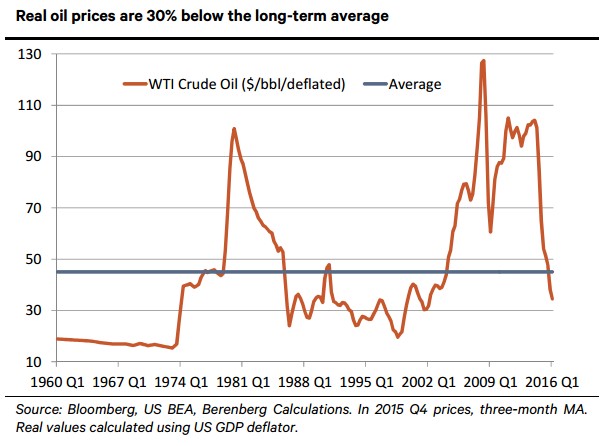 En este ámbito, desde Berenberg señalan que, a medio plazo, el precio real tenderá a su media histórica de 45 dólares por barril, aunque podría llevar tiempo. Tal y como refleja el siguiente gráfico, el aumento que experimentó el crudo la pasada década (descontando siempre la inflación) fue más largo y pronunciado que durante la última crisis del petróleo, registrada a finales de los 70.