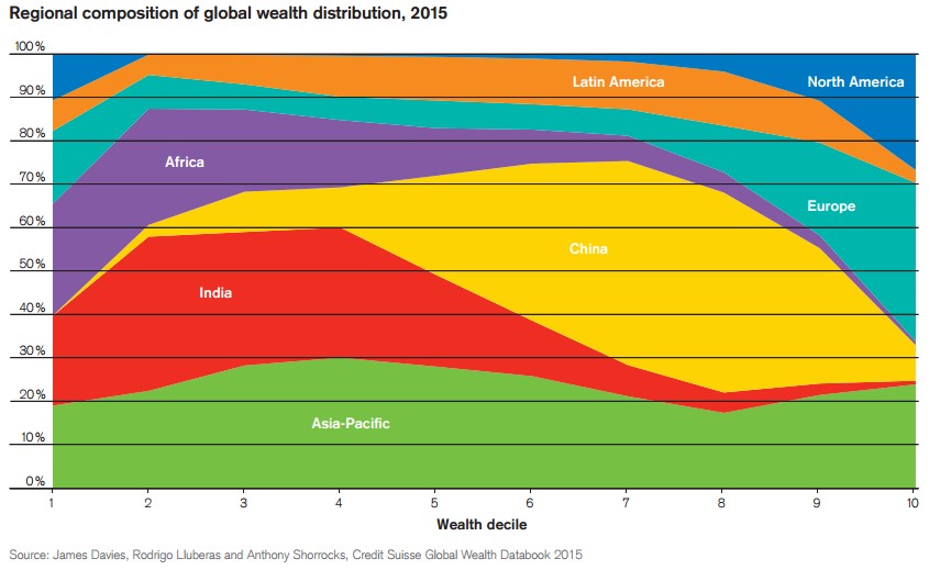 Tan sólo hay un pequeño detalle que no tiene en cuenta Oxfam. A saber, que el estudio de Credit Suisse es sobre la riqueza, no sobre la pobreza, y, por ello, descuenta todas las deudas, de tal forma que las cifras aludidas están reflejadas en términos netos, lo cual desvirtúa por completo las conclusiones acerca de la tan cacareada "desigualdad". Si se fijan en el siguiente gráfico, donde se incluye la ubicación geográfica de los distintos deciles, observarán que los chinos no están presentes en el grupo del 10% de los más "pobres" del mundo, pero son mayoría entre los deciles 6 y 8 (riqueza media y alta), mientras que europeos y norteamericanos representan más del 20% de los más "pobres" (esquina superior izquierda), según el vocabulario que emplea Oxfam.