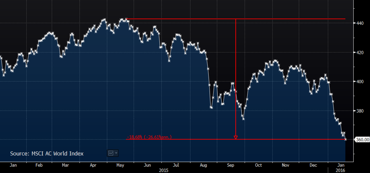 De momento, la evolución de las Bolsas internacionales en los primeros compases de 2016 arroja una tendencia preocupante, con un descenso del 18% frente al pico alcanzado durante el verano del pasado ejercicio 2015: