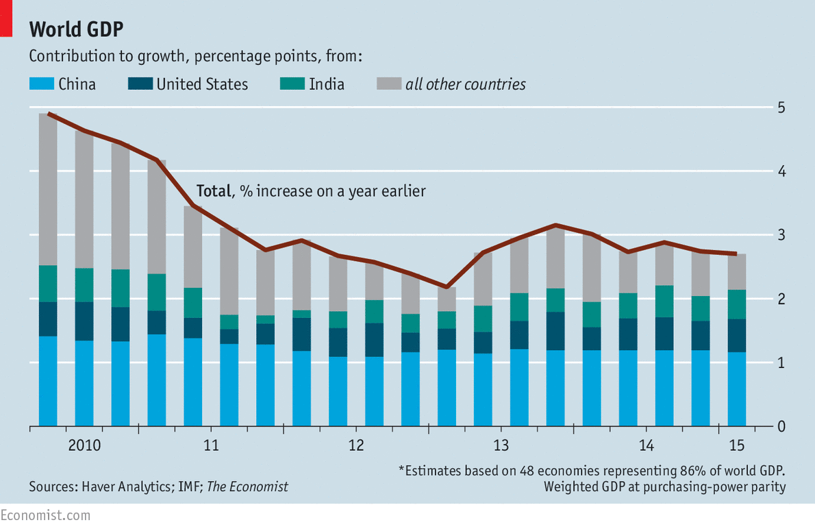 Un segundo factor para la desazón de los inversores es la caída del crecimiento mundial. Si hace apenas un lustro la economía avanzaba a un ritmo comprendido entre el 4% y el 5%, ahora nos movemos en datos que van del 2,5% al 3,5%.