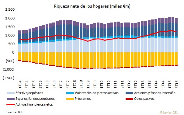 La Cuentas Financieras de los hogares del Banco de España ofrecen un detalle sobre sus activos y pasivos financieros. Como se puede observar en el siguiente gráfico, el total de activos (principalmente depósitos o efectivo, fondos de inversión y acciones) supera al de pasivos (préstamos), lo que resulta en una riqueza neta.