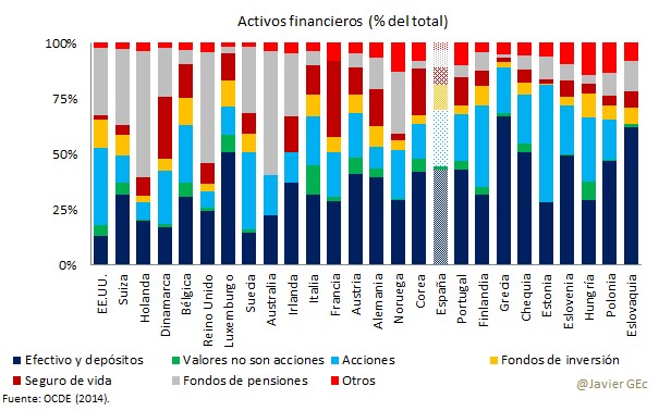 Si se compara el desglose de los activos financieros con los de la OCDE, se observa un mayor peso en los hogares españoles de activos de menor riesgo y mayor liquidez como efectivo y depósitos.