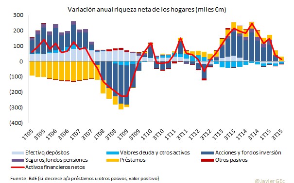 En resumen, la riqueza neta de las familias en el tercer trimestre de 2015 ha crecido gracias a que el necesario proceso de desapalancamiento ha tenido continuidad. Sin embargo, el valor de los activos financieros ha descendido ligeramente entre otros motivos por la corrección de las bolsas.