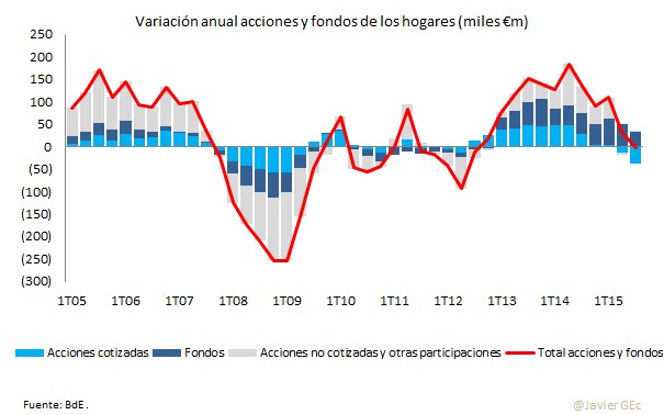Esta negativa evolución de los mercados con datos de marzo a septiembre suponía una pérdida anual de la riqueza de los hogares 37.611 millones de euros, pérdida que sería superior si se incluyera el impacto en la menor valoración de los fondos de inversión y acciones no cotizadas (en este segundo caso, el método habitual de valoración de acciones que no cotizan es por múltiplos respecto de valores comparables que sí cotizan).