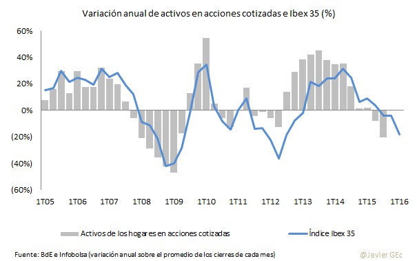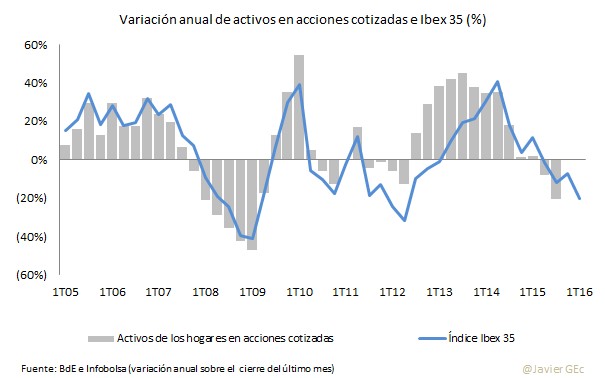 Con la caída en el inicio de año de las bolsas, una permanente pérdida de patrimonio de los hogares podría llegar a impactar a su vez en el consumo de las familias en 2016 vía menor efecto riqueza.
