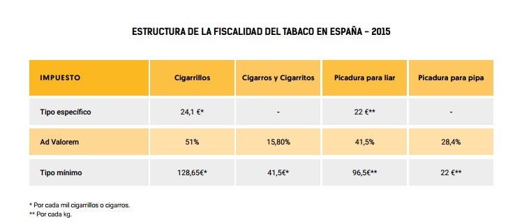 - Subidas de impuestos: en la última década, los gobiernos de PSOE y PP han venido incrementado sistemáticamente la fiscalidad de los cigarrillos hasta que se han convertido en el producto más gravado de España, lo que ha disparado su precio. Además del correspondiente IVA al 21%, el tabaco soporta un impuesto específico, que se aplica por unidad de producto (cigarros, cigarrillos o kilos) y otro ad valorem, que consiste en un porcentaje sobre el precio de venta al público (PVP). Además, también existe un tipo mínimo, que es una cantidad fija que debe tributar siempre que la combinación de los tipos anteriores no alcance su cuantía. En definitiva, el 77% el precio de la cajetilla corresponde a impuestos.