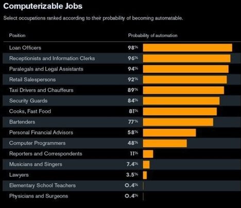 Podría decirse que el párrafo anterior es la parte positiva, pero este desarrollo también tiene otra cara. Las nuevas tecnologías harán que miles de puestos de trabajo ya no sean necesarios. Al igual que ahora hay menos mozos de cuadra que en 1900 o menos taquilleros de cine que en 1980, en 2025 o 2030 habrá menos trabajadores en otros puestos. El siguiente gráfico muestra los empleos que más probabilidades tienen de ser automatizados, según un estudio de la Universidad de Oxford. El primero sería algo así como "agente de préstamos" y haría referencia a aquellas personas que evalúan la idoneidad de una persona para ser merecedora de un crédito. Cada vez más, la decisión la tomará un ordenador, en función de las características del peticionario: ingresos, historial de pagos, bienes en propiedad, cantidad demandada…