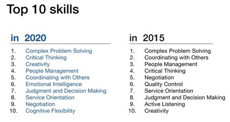 Esto nos lleva al siguiente gráfico, que recoge qué es lo que están buscando las empresas de 2015 y qué buscarán en 2020. No nos referimos tanto a una titulación oficial o una formación reglada, sino más bien a las habilidades que los empleadores más valoran. No es algo baladí. Por ejemplo, hace medio siglo, las pruebas de los departamentos de recursos humanos se centraban en conocimientos objetivos más o menos fáciles de comprobar.