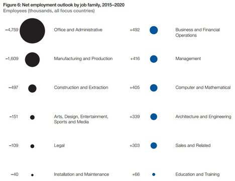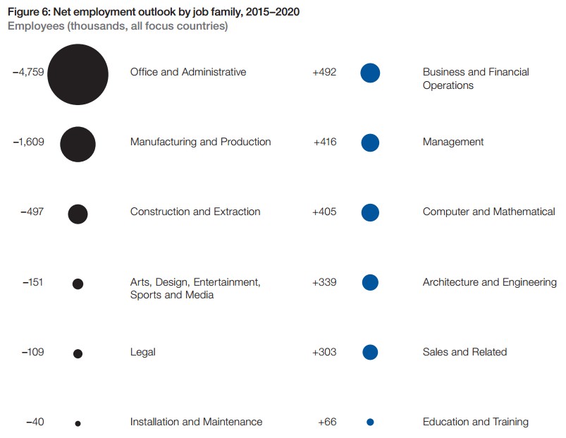 Con todo esto en la cabeza, habrá quien se pregunte qué es lo que debe hacer para adaptarse al nuevo mercado laboral que se nos viene encima. ¿Cambiar de sector? ¿Dar unos cursos? Sólo con inglés e informática ya no se va ni a la vuelta de la esquina. Según el informe del WEF, El futuro del empleo, habrá industrias que perderán millones de empleos en los próximos cinco años y otras que los ganarán. Como puede verse en el siguiente gráfico, entre los que pierden tenemos los trabajos administrativos y manufactureros; los ganadores del cambio están más distribuidos, con el sector financiero y el informático en cabeza de la tendencia positiva.