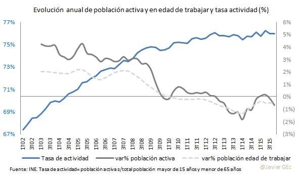 Un dato que confirma dicho envejecimiento es la evolución de los mayores de 64 años sobre el total de población mayor de 16: del 19,5% en el cuatro trimestre de 2009, al 20,1% en el de 2011, 21,0% en 2013 y finalmente 21,7% en el último de 2015.