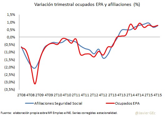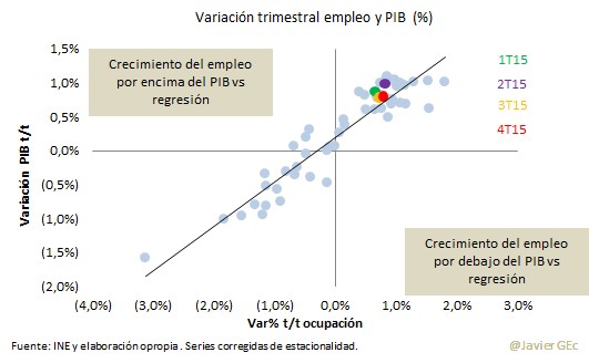 El crecimiento de la ocupación fue del 0,8%, lo cual significa que el empleo crece relativamente más que el PIB (el avance del INE del cuarto trimestre es del 0,8%), al igual que ha sucedido en el resto de trimestres de 2015.