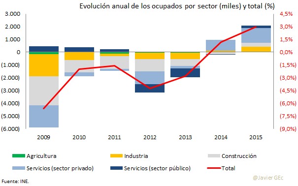 La ocupación cerró 2015 con un aumento del 3%, con la industria y la construcción generando nuevos puestos de trabajo, aunque es el sector servicios donde se concentra la mayor parte de la creación de empleo. Dentro de los servicios, destaca el sector público, ya que pone fin a tres años de reducción de plantilla, posiblemente impulsado por el ciclo electoral de las municipales, autonómicas y generales en 2015.