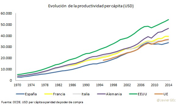 Sobre este segundo riesgo, en un escenario de estancamiento o caída del empleo como consecuencia del citado envejecimiento demográfico, la economía sólo podría crecer mediante incrementos en la producción por empleado. Y el problema aquí es que España, por desgracia, no se caracteriza, precisamente, por el aumento de su productividad.