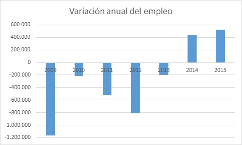 España cerró 2015 con una cifra de ocupados de casi 18,1 millones de personas: 525.000 más que hace un año y prácticamente un millón más que a cierre de 2013. Se trata de cifras muy positivas que contrastan con las experimentadas durante lo más hondo de la crisis económica: entre 2009 y 2013 se destruyeron tres millones de empleos, una media de 600.000 puestos de trabajo anuales.