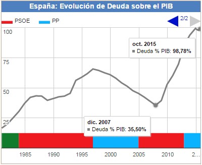 Si nos fijamos en España, la deuda pública pasa del 35% del PIB en 2007 hasta rozar el 100% en 2015.