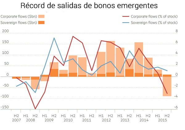 En la segunda mitad de 2015 la inversión nueva y neta en bonos emergentes en moneda extranjera fue negativa en 79.000 millones de dólares. Unos datos que superan con mucho los 57.200 millones de dólares que salieron de los mercados durante la segunda mitad de 2008 por culpa de la crisis financiera, según los datos recogidos por David Spegel, jefe de estrategia global de Mercados Emergentes en el ICB Starndard Bank.