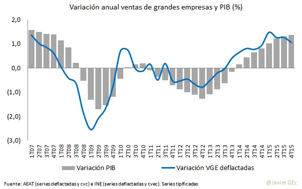La Agencia Tributaria (AEAT) elabora con carácter mensual, a partir de las declaraciones de IVA, una estadística de ventas de grandes empresas -facturación anual superior a 6 millones de euros- con un desglose por destino geográfico (ventas interiores o exteriores), económico (bienes y servicios de consumo y de capital) y sectorial (industria, servicios y construcción).