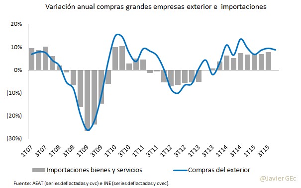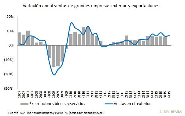 La mejora de las exportaciones, que incluyen las ventas de mercancías y de servicios no turísticos, es el aspecto más positivo. Más aún si se tiene en cuenta que el comercio mundial de mercancías se encuentra en continua desaceleración desde finales de 2014, al pasar de un avance del 4% a finales de 2014 al 2% en la primera mitad de 2015 y apenas al 1% en el último trimestre.