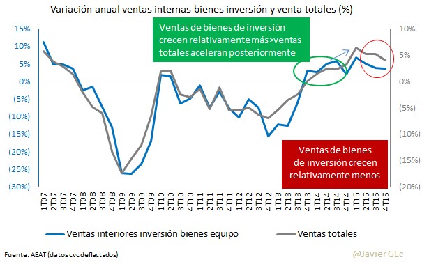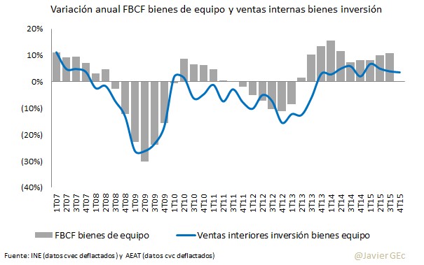 Las ventas interiores de bienes de equipo, que pueden asimilarse con la inversión en maquinaria, sí que ofrecen una foto menos positiva. Como indica la Agencia Tributaria, el crecimiento en 2015 supera al de 2014, pero también es cierto que la tendencia es de desaceleración, con una tasa de crecimiento desde casi el 7% en el inicio de 2015 a menos del 4% a final del año.