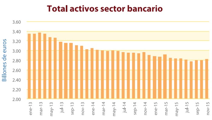 El informe señala que "después de varios años de desapalancamiento y de reducción de balance, podríamos pensar que la banca española está cerca de su suelo a nivel de activos. En noviembre del 2015, el balance agregado registró los 2,82 billones de euros, mostrando un aumento del 1,3% desde el mínimo de agosto de ese mismo año".