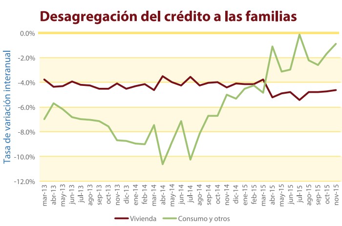 - Crecimiento anual del crédito al consumo y otros (noviembre 2015): -0.86% (-4.99% noviembre 2014).
