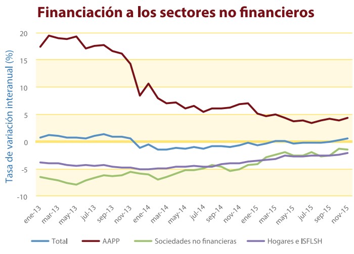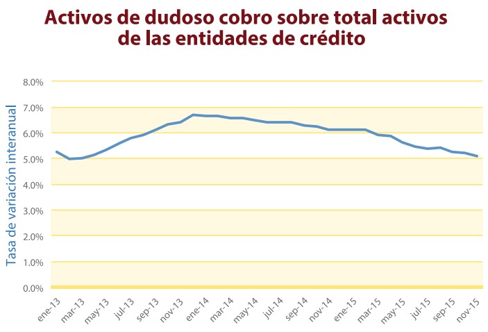 Por último, otra señal positiva para el sector es la reducción acelerada del porcentaje de activos de dudoso cobro respecto al total de activos de las entidades de crédito. "Esta tasa ha caído desde el máximo de 6,7% en diciembre del 2013 a 5,1% en noviembre del 2015".