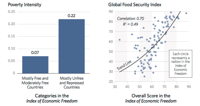 A la izquierda vemos que la incidencia de la pobreza es del 7% en las economías abiertas y del 22% en las economías intervenidas. En cuanto a la pobreza alimentaria, son los países más capitalistas los que menos sufren esta lacra.