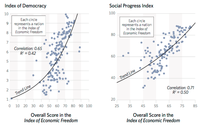No han faltado quienes han intentado oponer capitalismo a democracia. La gráfica de la izquierda muestra que la realidad es muy distinta: las economías más libres suelen ser también países de gran calidad democrática. Lo mismo ocurre con el progreso social, reflejado en la gráfica de la derecha.