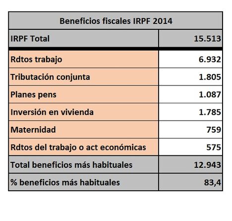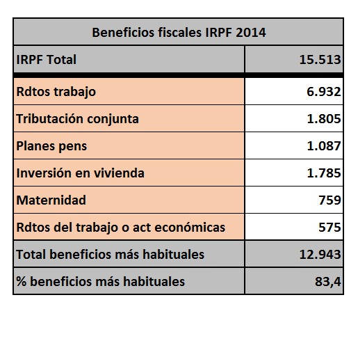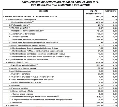 Parece, por lo tanto, que los beneficios fiscales más habituales se quedan fuera de la subida de Podemos. El problema es que entonces las cuentas no salen. El siguiente es el cuadro oficial del Ministerio de Hacienda sobre el coste de los beneficios fiscales para el ejercicio 2014. Como vemos, su estimación es de 15.000 millones.