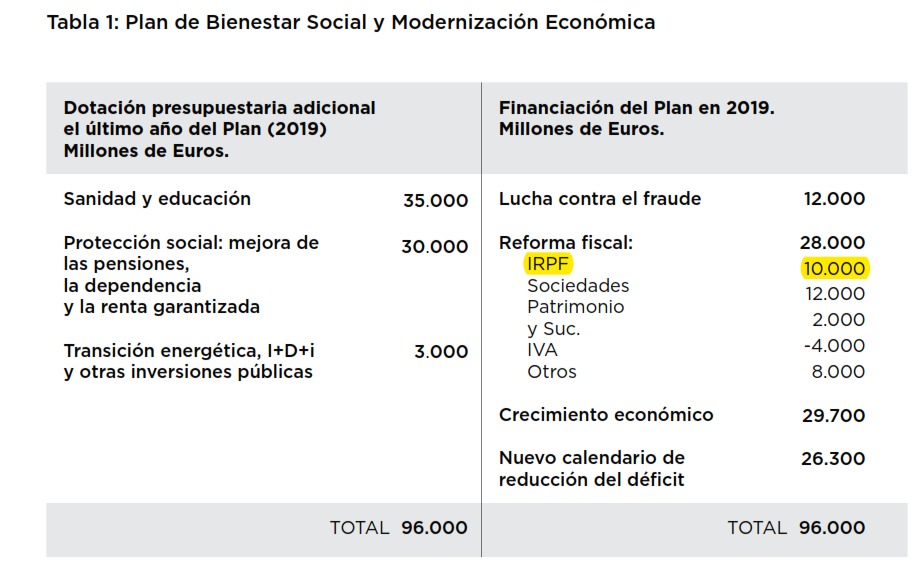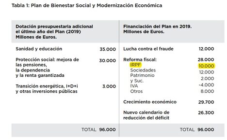 Sin embargo, lo que no está tan claro es el detalle. Por ejemplo, en lo que hace referencia al IRPF, en Podemos creen que lograrán un incremento de la recaudación de 10.000 millones en esta legislatura (ver cuadro).
